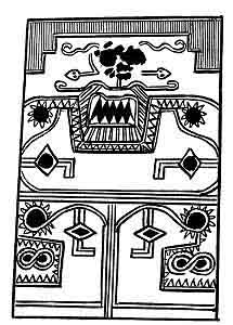The design of this lower division is the two halves of a head placed back to back with each other. The eyes are again formed of the sun as Kin, the celestial orb, again telling us that this tableau refers to the earth, not to heaven.