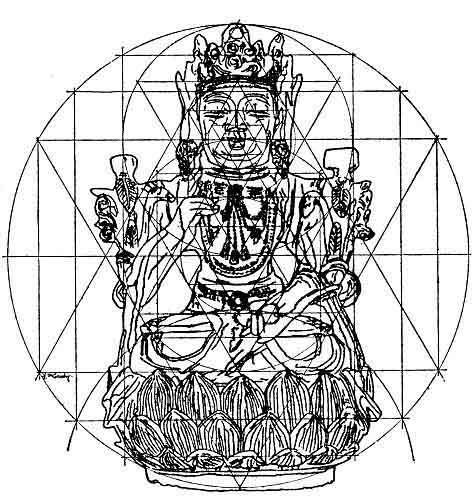 The bronze statue here drawn and analyzed by Miss de Gruchy is one of the most ancient bronzes in existence. It is more than 18,000 years old. Its basic design theme is the equilateral triangle, and the skill and rigid consistency with which the whole and its parts are made to adhere to that theme are remarkable.